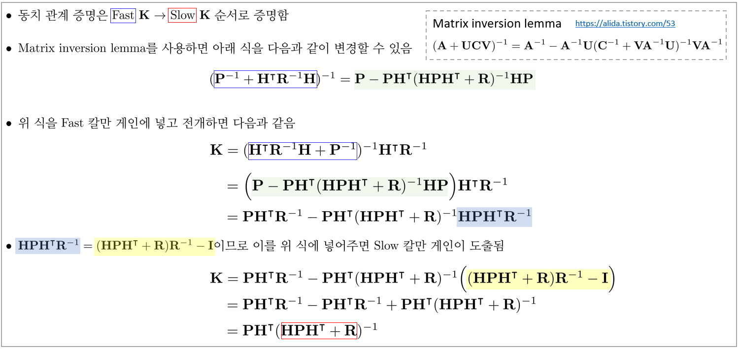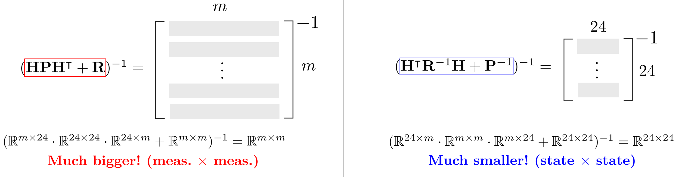 \mathbf{K} = \mathbf{PH}^{\intercal}(\mathbf{HPH}^{\intercal} + \mathbf{R})^{-1} \quad \rightarrow \quad \mathbf{K} = (\mathbf{H}^{\intercal}\mathbf{R}^{-1}\mathbf{H} + \mathbf{P}^{-1})^{-1}\mathbf{H}^{\intercal}\mathbf{R}^{-1}