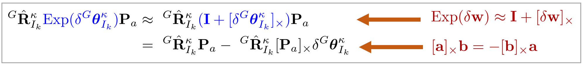 & = \ ^{G}\hat{\mathbf{R}}_{I_k}^{\kappa}\mathbf{P}_{a} -\ ^{G}\hat{\mathbf{R}}_{I_k}^{\kappa}[\mathbf{P}_{a}]_{\times}\delta^{G}\boldsymbol{\theta}_{I_k}^{\kappa}