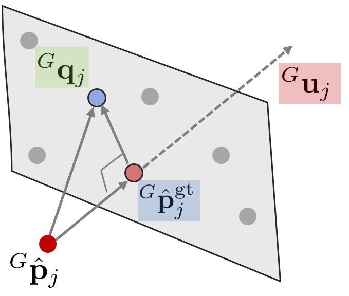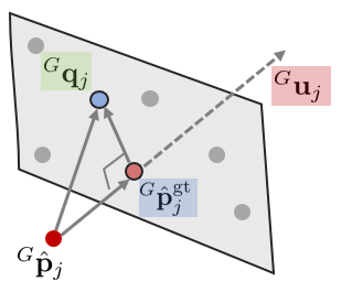 &=\ ^{G}\mathbf{u}_{j}^{\intercal}(\ ^{G}\mathbf{T}_{I_k}\ ^{I}\mathbf{T}_{L_k}\ {\color{Mahogany} ^{L}\mathbf{p}_{j}^{gt} } -\ ^{G}\mathbf{q}_{j}) \\