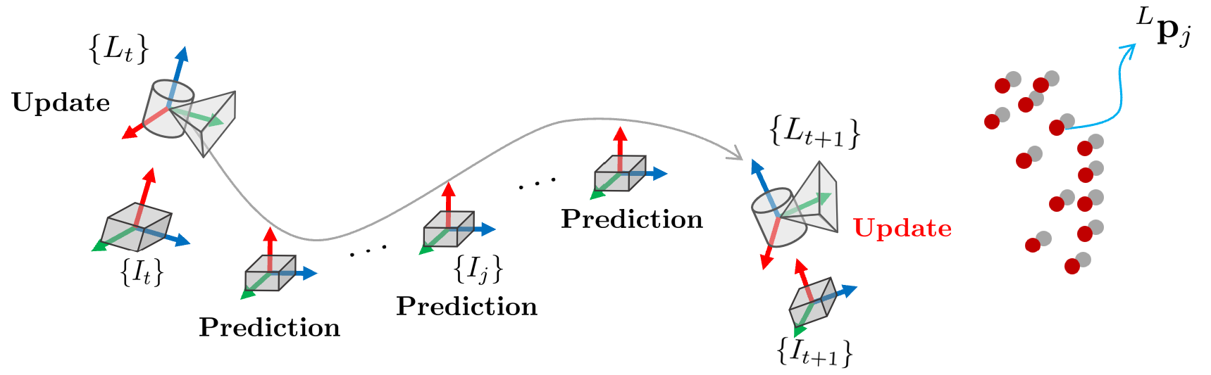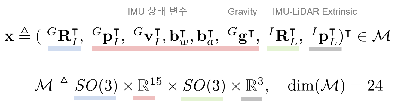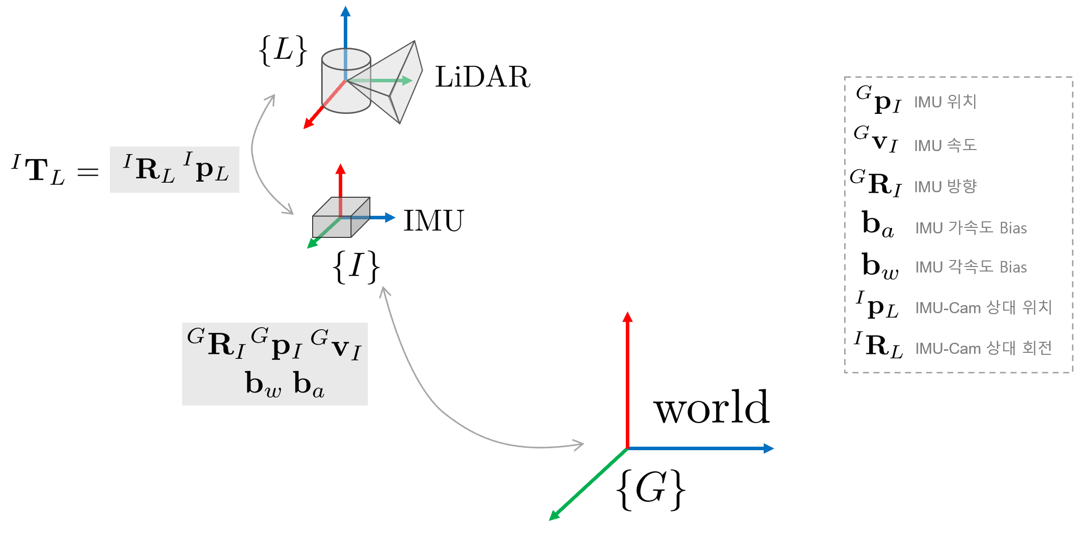 일반적으로 IMU는 LiDAR와 함께 결합된 상태로 3차원 공간 상에서 움직인다. LiDAR와 IMU의 extrinsic은 $^{I}\mathbf{T}_{L} =\ [^{I}\mathbf{R}_{L} \ ^{I}\mathbf{p}_{L}]$와 같이 표기하고 월드 좌표계 $\{G\}$로부터 IMU의 방향, 위치, 속도, bias는 각각 $^{G}\mathbf{R}_{I}, ^{G}\mathbf{p}_{I}, ^{G}\mathbf{v}_{I}, \mathbf{b}_w, \mathbf{b}_a$와 같이 표기한다.