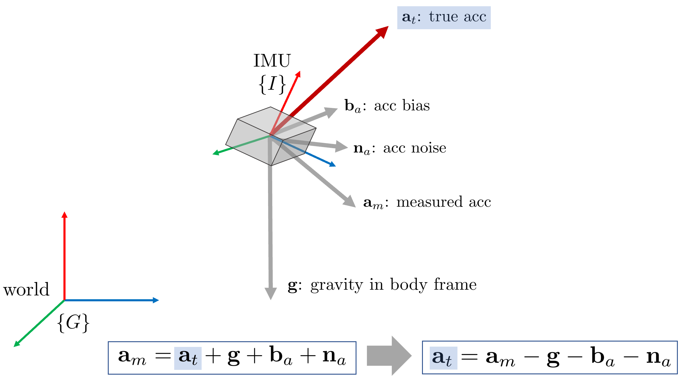 & ^{G}\dot{\mathbf{v}}_{I} =\ ^{G}\mathbf{R}_{I}{\color{Cyan} \mathbf{a}_{t} }+\ ^{G}\mathbf{g} =\ ^{G}\mathbf{R}_{I} {\color{Cyan}(\mathbf{a}_{m}-\mathbf{b}_{a} - \mathbf{n}_{a}) } +\ ^{G}\mathbf{g} \\
