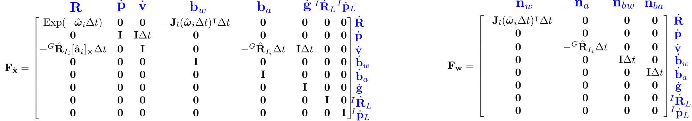 \text{Exp}(-\hat{\boldsymbol{\omega}}_i \Delta t) & \mathbf{0} & \mathbf{0} & -\mathbf{J}_r(\hat{\boldsymbol{\omega}}_i \Delta t)\Delta t & \mathbf{0} & \mathbf{0} & \mathbf{0}& \mathbf{0} \\
