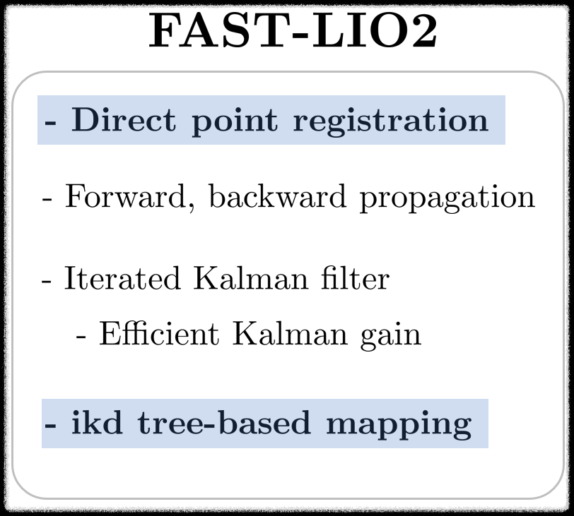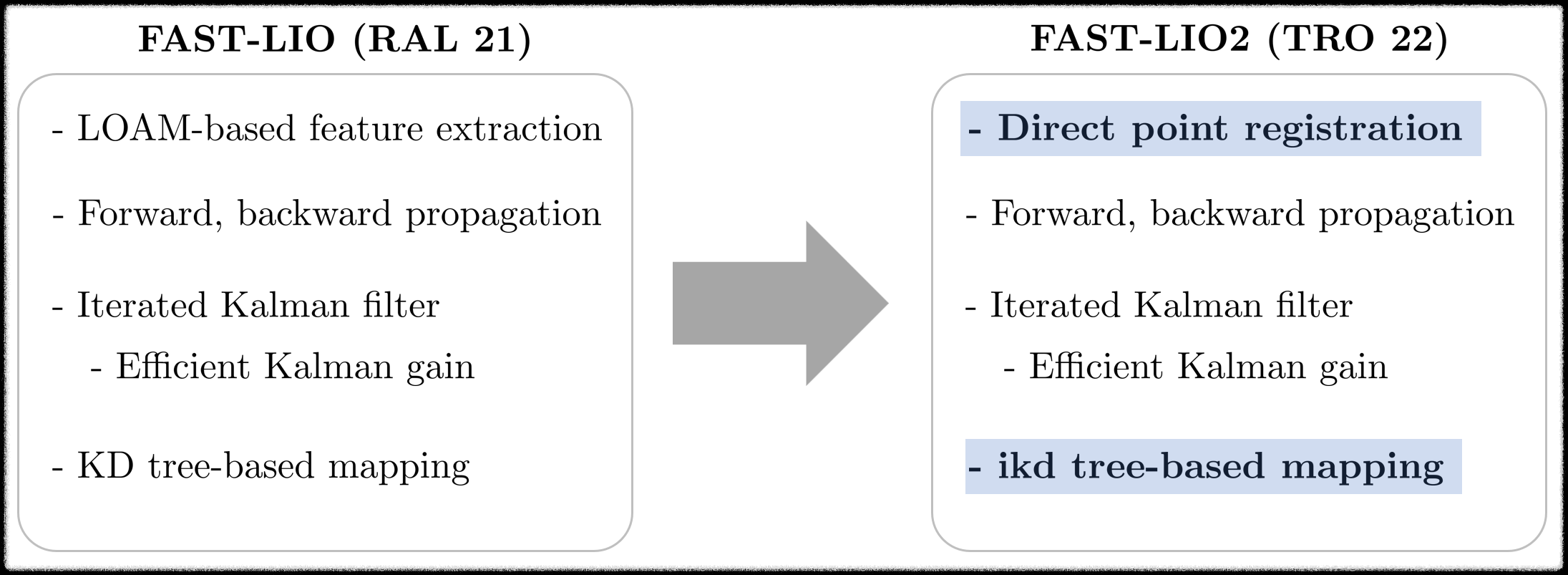 FAST-LIO와 FAST-LIO2의 차이점을 알고리즘 파이프라인으로 표현하면 다음과 같다.