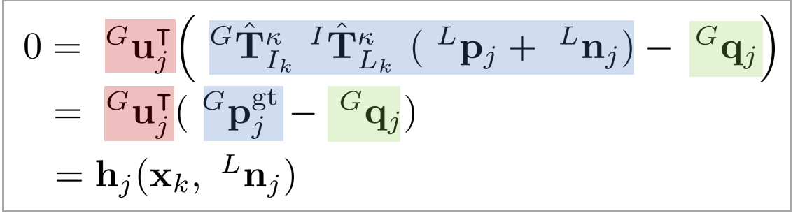 \mathbf{h}_{j}(\mathbf{x}_{k},\ ^{L}\mathbf{n}_{j}) &=\ ^{G}\mathbf{u}_{j}^{\intercal}(\ ^{G}\mathbf{T}_{I_k}\ ^{I}\mathbf{T}_{L_k}{\color{Mahogany} (\ ^{L}\mathbf{p}_{j} +\ ^{L}\mathbf{n}_{j}) } -\ ^{G}\mathbf{q}_{j}) \\