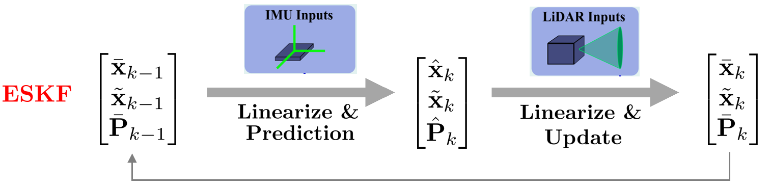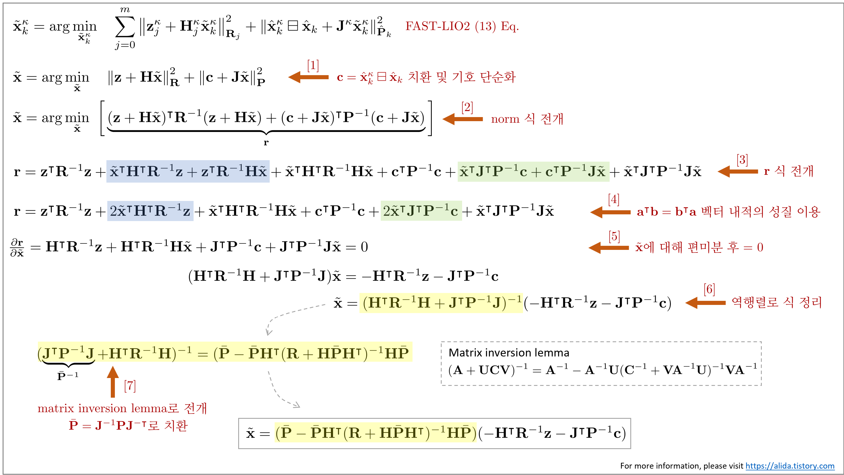 다음으로 FAST-LIO2의 IKF 과정 중 업데이트 스텝부터 $\tilde{\mathbf{x}}_{k}^{\kappa}$까지 중간 과정을 유도해보자. 이는 주로 링크의 내용을 참고하여 유도하였다. 수식 유도 과정이 길고 복잡하기 때문에 아래와 같이 색상으로 강조하여 표현하였다.