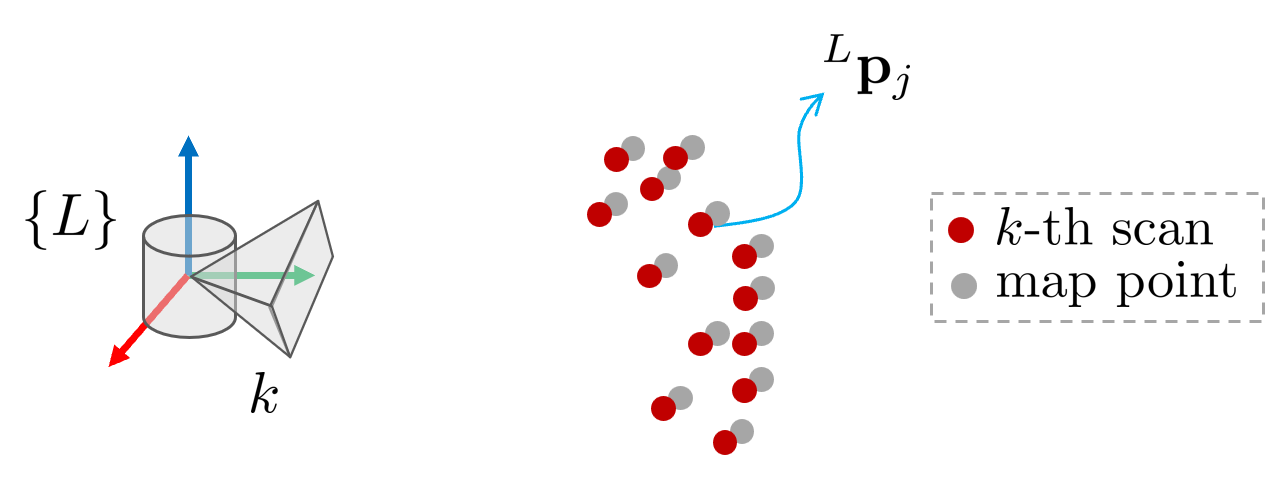 LiDAR 센서에서 $k$번째 스캔의 $j$번째 포인트는 다음과 같이 나타낼 수 있다.
