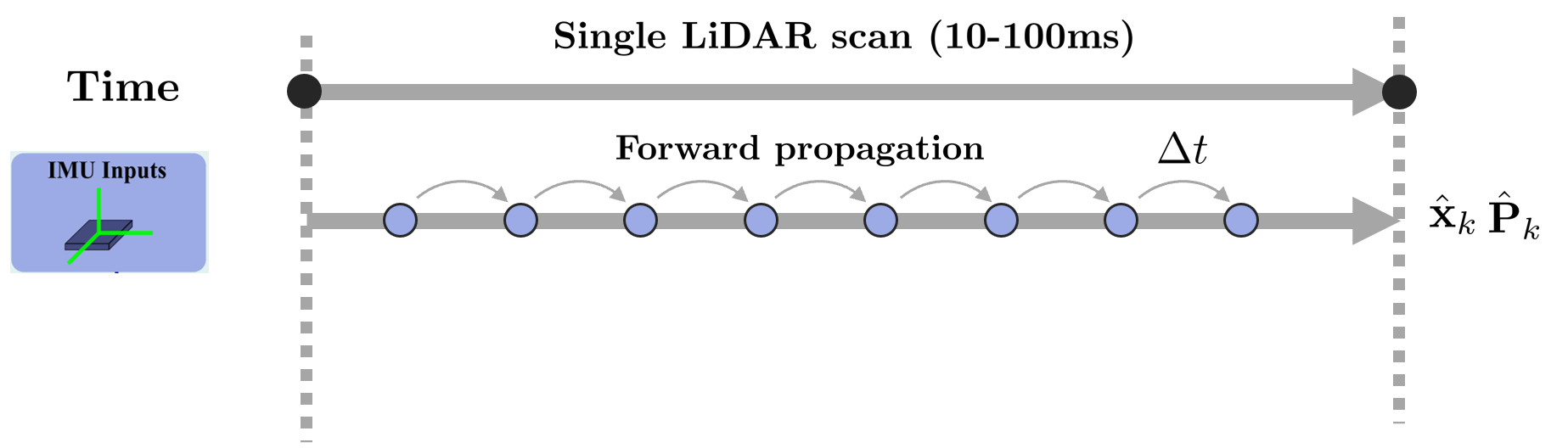 상태천이모델 $\mathbf{f}(\mathbf{x}, \mathbf{u}, \mathbf{w})$을 통해 시간에 따른 IMU 시스템의 변화를 컴퓨터로 연산하기 위해서는 연속 시간(Continuous Time)에 대한 값을 이산 시간(Discrete Time)에 대한 차분 방정식으로 변환해야 한다. 미분 방정식에 대한 수치 해법은 여러 방법(Euler, Mid-point, RK4, etc)들이 있으나 FAST-LIO2는 Euler Method를 사용하였다.