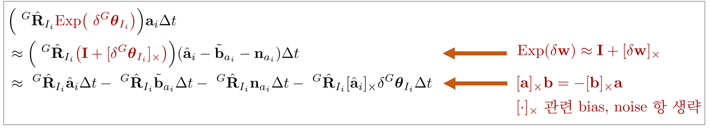 $\mathbf{x}_{k} = \hat{\mathbf{x}}_{k}^{\kappa} \boxplus \tilde{\mathbf{x}}_{k}^{\kappa}$를 대입하여 에러 상태 변수까지 고려하여 전개하면 다음과 같다.