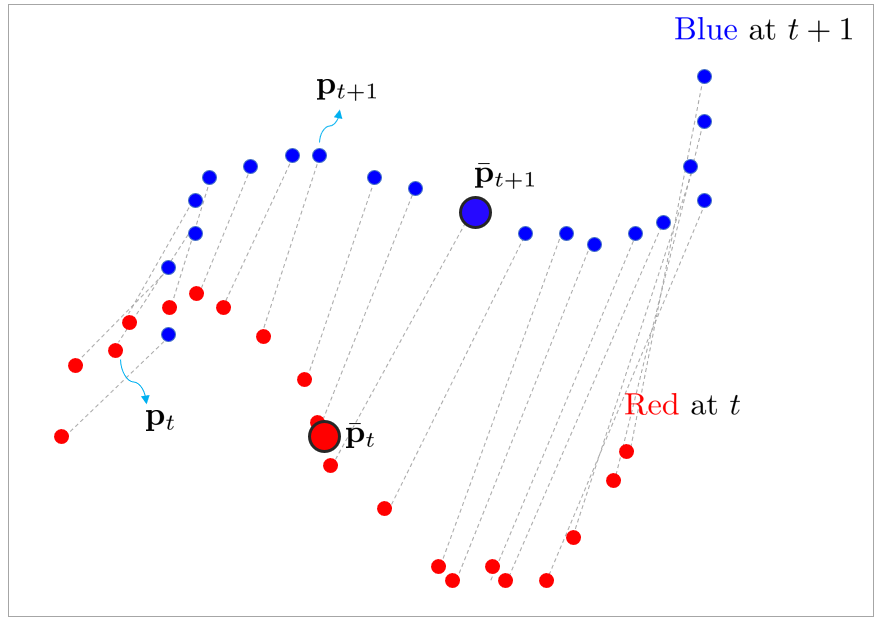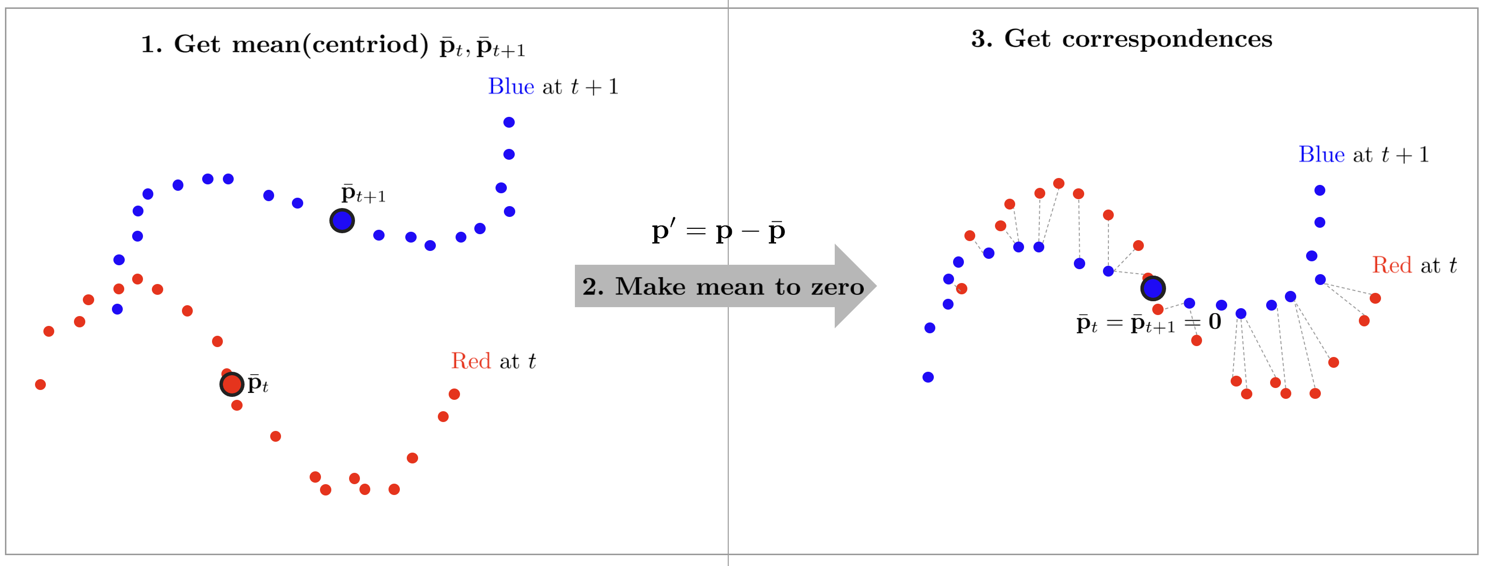 이 때, 두 점군의 이동 벡터 $\mathbf{t}$는 $t+1$시점 점군의 무게중심 $\bar{\mathbf{p}}_{t+1}$과 $t$ 시점 회전한 점군의 무게중심 $\mathbf{R}\bar{\mathbf{p}}_{t}$의 차이로 설정한다. 즉, 두 점군의 상대 회전량을 정확히 보정한다면 두 점군은 정확히 $\mathbf{t}$만큼 떨어져 있다고 가정하는 것이다.