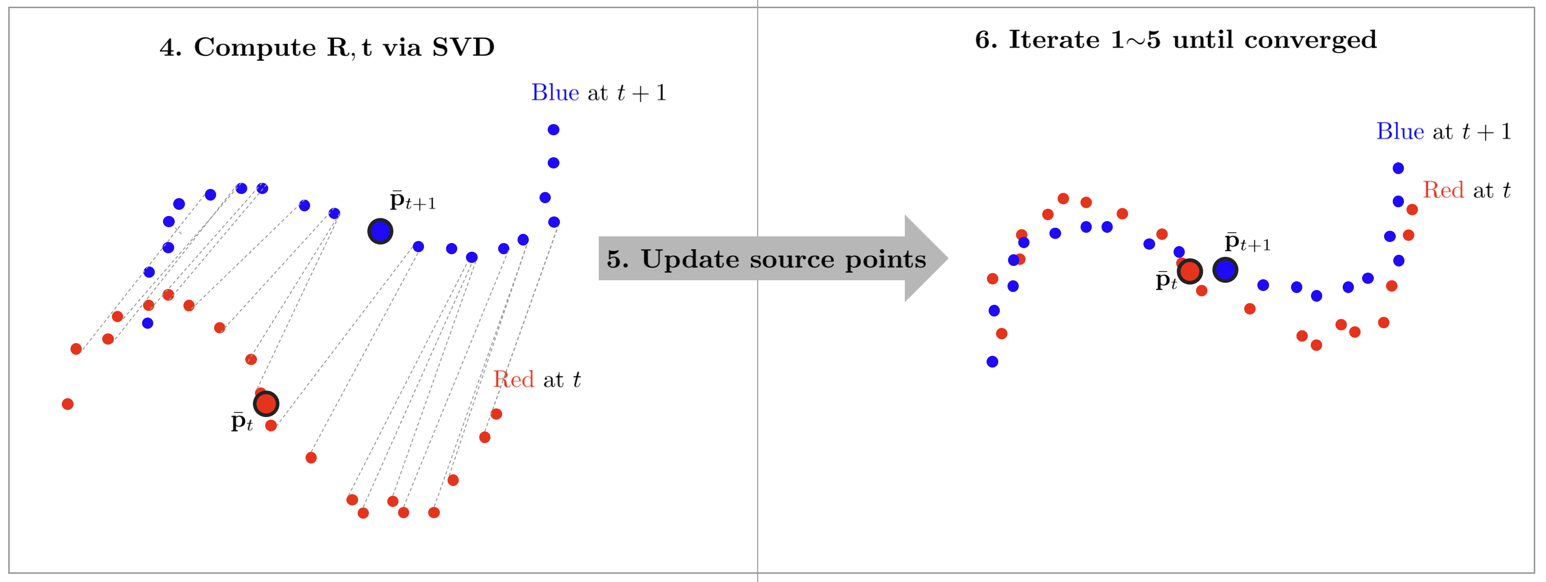 \arg\min_{\mathbf{R},\mathbf{t}} \| {\color{Cyan}\mathbf{p}_{t+1}} - \mathbf{R} {\color{Red} \mathbf{p}_{t}} - \mathbf{t} \|^2