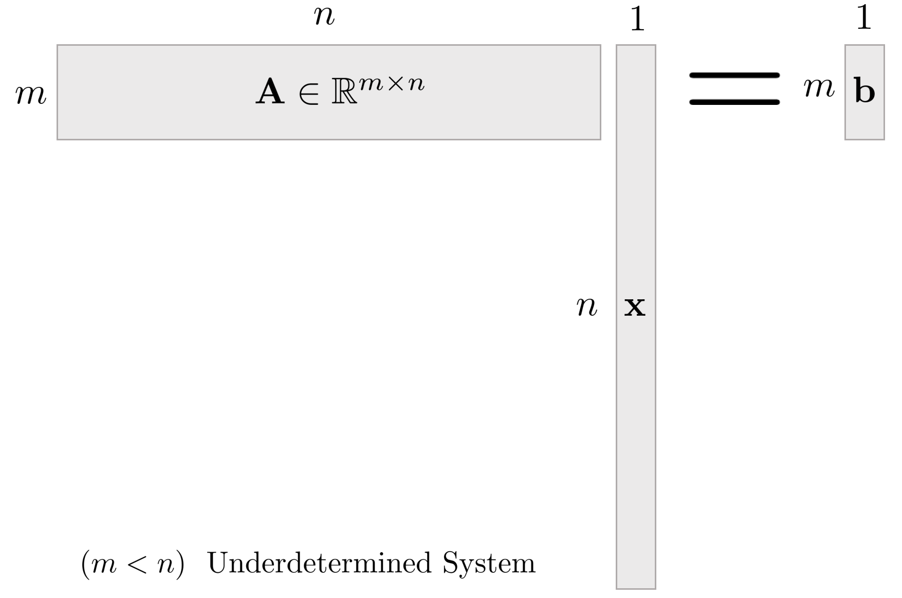 Under-determined 시스템의 경우 방정식의 개수보다 미지수의 개수가 많은 경우를 의미한다. 즉, over-determined 시스템과 반대로 $n > m$ 인 경우를 의미한다. Under-determined 시스템의 경우 무수히 많은 해가 존재하며 full row rank를 가진다.