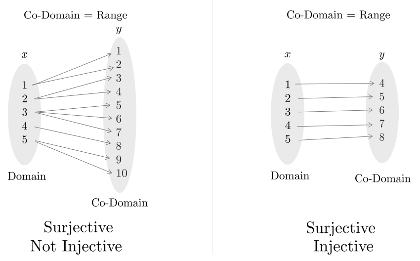이 때 입력 $x$에 의해 매핑되는 출력 $y$는 유일하게 결정된다. 정의역(Domain) 이란 입력 $x$ 의 모든 가능한 집합을 의미한다. 공역(Co-Domain) 이란 출력 $y$의 모든 가능한 집합을 의미한다. Image 란 주어진 입력 $x$에 대해 매핑된 출력 $y$를 의미한다. 치역(Range) 란 Domain내에 있는 입력 $x$들에 의해 매핑된 모든 출력 $y$의 집합을 의미한다.