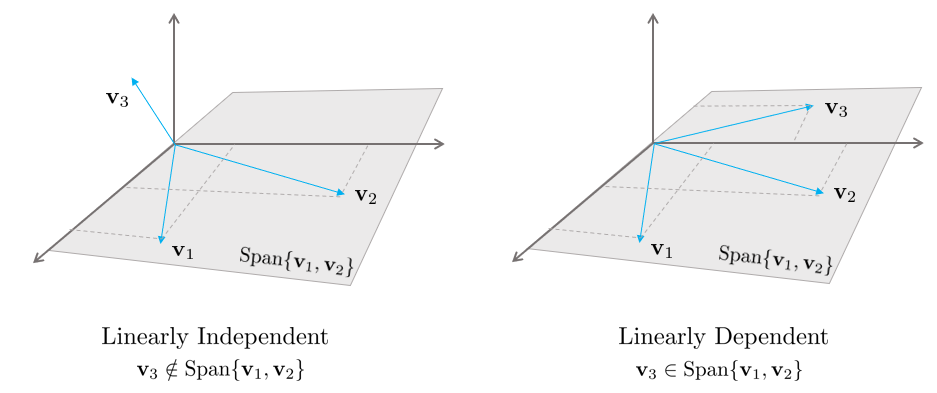만약 $\mathbf{v}_{j}$가 선형결합으로 표현이 된다면 $\mathbf{v}_{1}, \cdots, \mathbf{v}_{n}$는 선형의존 (Linearly Dependent) 이다. 만약, $\mathbf{v}_{j}$가 표현되지 않는다면 $\mathbf{v}_{1}, \cdots, \mathbf{v}_{n}$는 선형독립 (Linearly Independent) 이다.