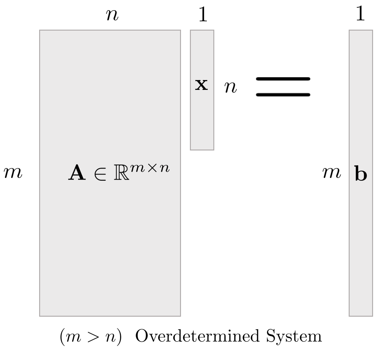 Over-determined 시스템은 방정식의 개수가 미지수의 개수보다 많은 경우를 의미한다. $\mathbf{Ax} = \mathbf{b}$ 의 형태에서 $\mathbf{A} \in \mathbb{R}^{m\times n}, \mathbf{x} \in \mathbb{R}^{n\times1}, \mathbf{b} \in \mathbb{R}^{m\times 1}$ 이라고 했을 때 $m > n$ 인 경우를 의미한다. Over-determined 시스템의 경우 해가 존재하지 않으며 full column rank를 가진다.