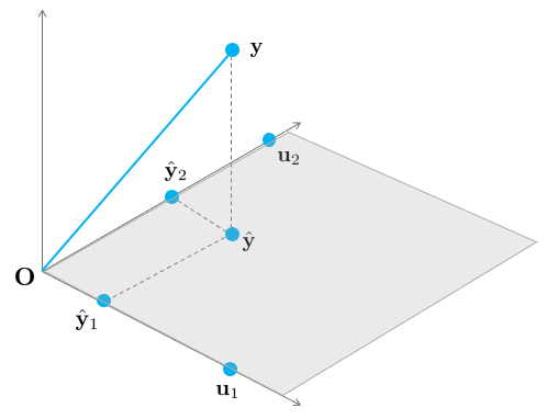 $\mathbb{R}^{n}$ 공간의 부분공간(Subspace) H는 $\mathbb{R}^{n}$의 부분집합들의 선형결합에 대해 닫혀 있는 공간을 의미한다. 즉, 두 벡터 $\mathbf{u}_{1}, \mathbf{u}_{2} \in H$일 때, 어떠한 스칼라 값 $c,d$에 대하여 $c\mathbf{u}_{1} + d \mathbf{u}_{2} \in H$일 때 H를 부분공간이라고 한다.