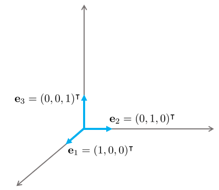3차원 공간 $\mathbb{R}^{3}$ 의 경우 기저벡터는 3개가 존재하고 $\mathbf{e}_{1} = [ 1 \ 0 \ 0 ]^{\intercal}, \mathbf{e}_{2} = [ 0 \ 1 \ 0 ]^{\intercal}, \mathbf{e}_{3} = [ 0 \ 0 \ 1 ]^{\intercal}$일 때, 이를 표준기저벡터(Standard Basis Vector)라고 한다.