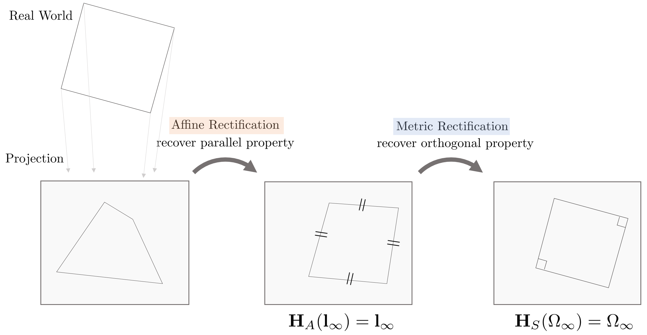 이 때, 회전행렬 $\mathbf{R}$의 자유도는 3이므로 2개 이상의 소실점 쌍을 사용하면 회전행렬을 복원할 수 있다.