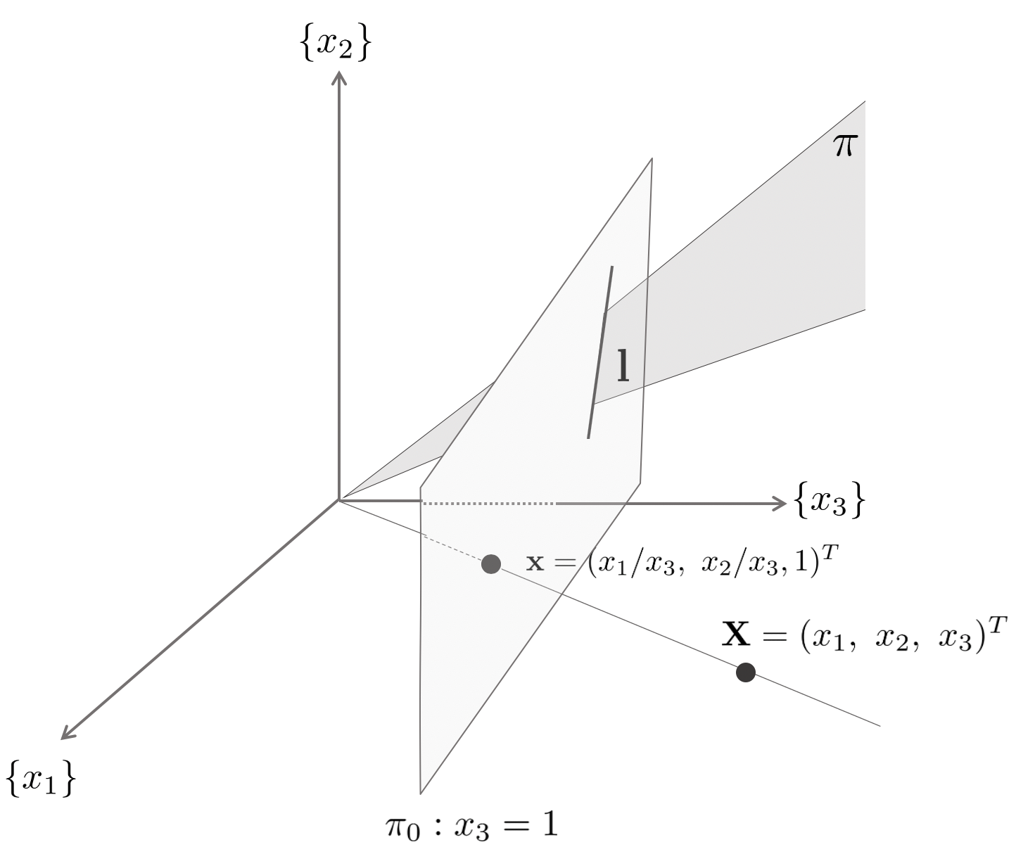 $\mathbb{P}^{2}$ 공간에서는 스케일 값에 관계없이 한 점을 유일하게 정의할 수 있으므로 마지막 항 $x_{3}$로 좌표값을 나눈 $(x_{1}/x_{3}, x_{2}/x_{3}, 1)$를 일반적으로 한 점을 표현하는 대표값으로 간주한다. 따라서 $\mathbb{R}^{3}$ 공간 상의 원점을 지나는 직선과 $x_{3}=1$인 평면이 교차하는 점이 곧 $\mathbb{P}^{2}$ 공간 상의 한 점이 된다.