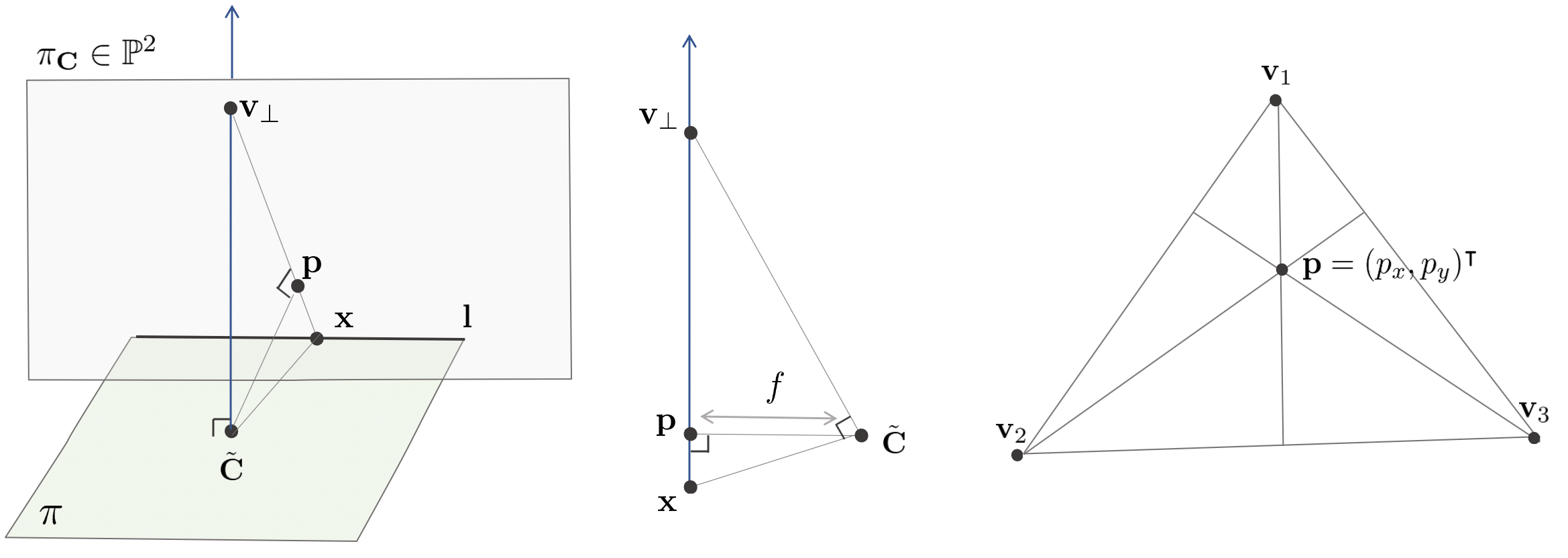 3차원 공간 상의 평면 $\pi$에 수직인 물체들의 소실점을 수직소실점(vertical vanishing point) $\mathbf{v_{\perp}}$라고 한다.