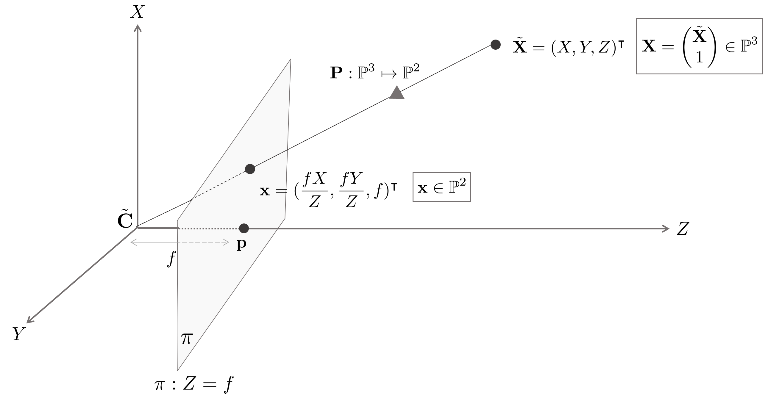 $\mathbf{X}$의 모든 원소에 임의의 값 $k$를 곱해도 이는 원점과 $\mathbf{X}$를 잇는 직선 위에 존재하며 이러한 성질을 homogeneous 성질이라고 한다. 만약 $k=1/Z$를 곱해주면 3차원 점을 $Z=1$ 평면에 프로젝션한 것과 기하학적으로 동일한 의미를 지닌다.