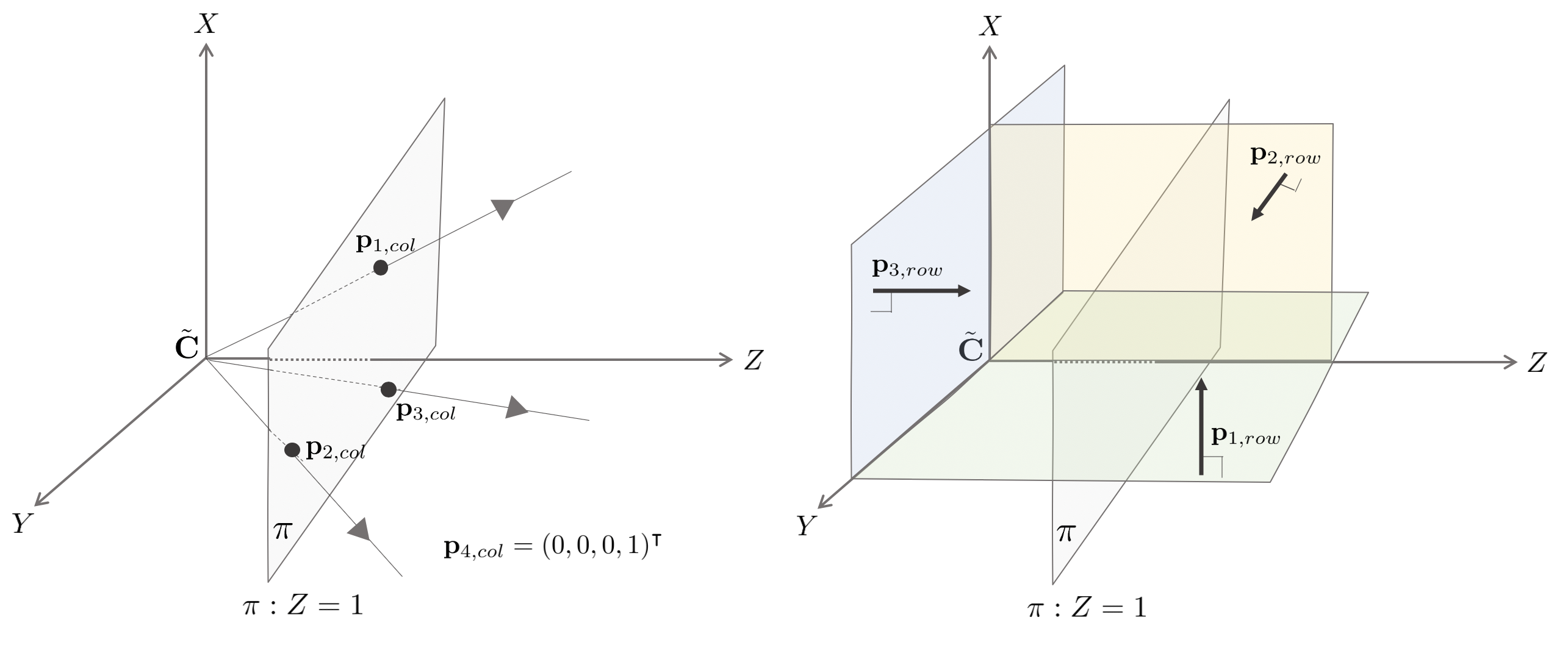 이미지 평면에서 두 개의 직선 $\mathbf{l}_{1}, \mathbf{l}_{2}$를 Back-projection한 두 평면들이 서로 직교하는 경우 다음을 만족한다.