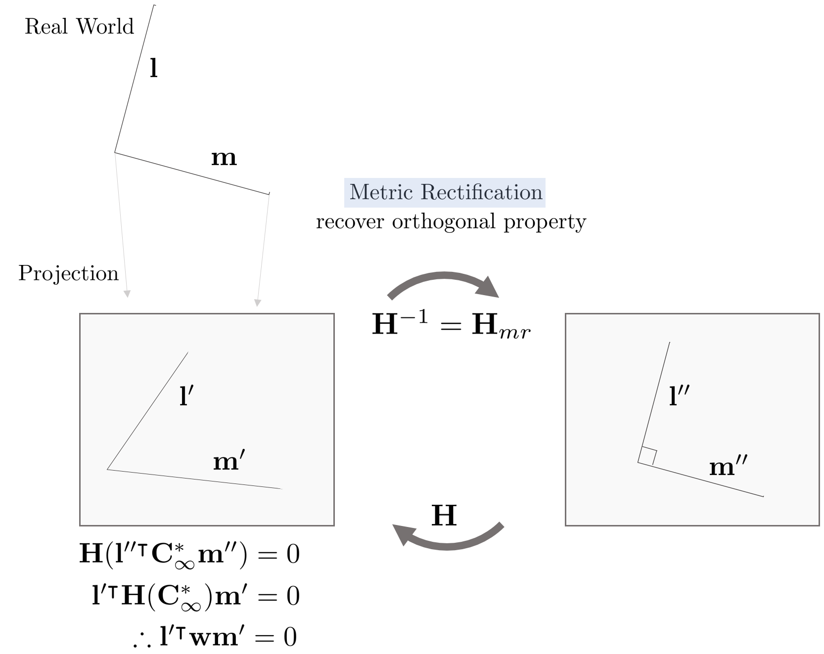 이미지 평면 상의 두 점 $\mathbf{x}_{1}, \mathbf{x}_{2}$를 Back-projection하면 두 직선 $\mathbf{K}^{-1}\mathbf{x}_{1}, \mathbf{K}^{-1}\mathbf{x}_2$가 생성된다. 만약 두 직선이 직교하는 경우 $\mathbf{x}_{1}^{\intercal}\mathbf{w}\mathbf{x}_{2}=0$의 공식이 성립한다. 그리고 $\mathbf{x}_{1}$가 직선 $\mathbf{l}$에 포함되어 있으면 $\mathbf{x}_{1}^{\intercal}\mathbf{l}=0$이 성립한다.