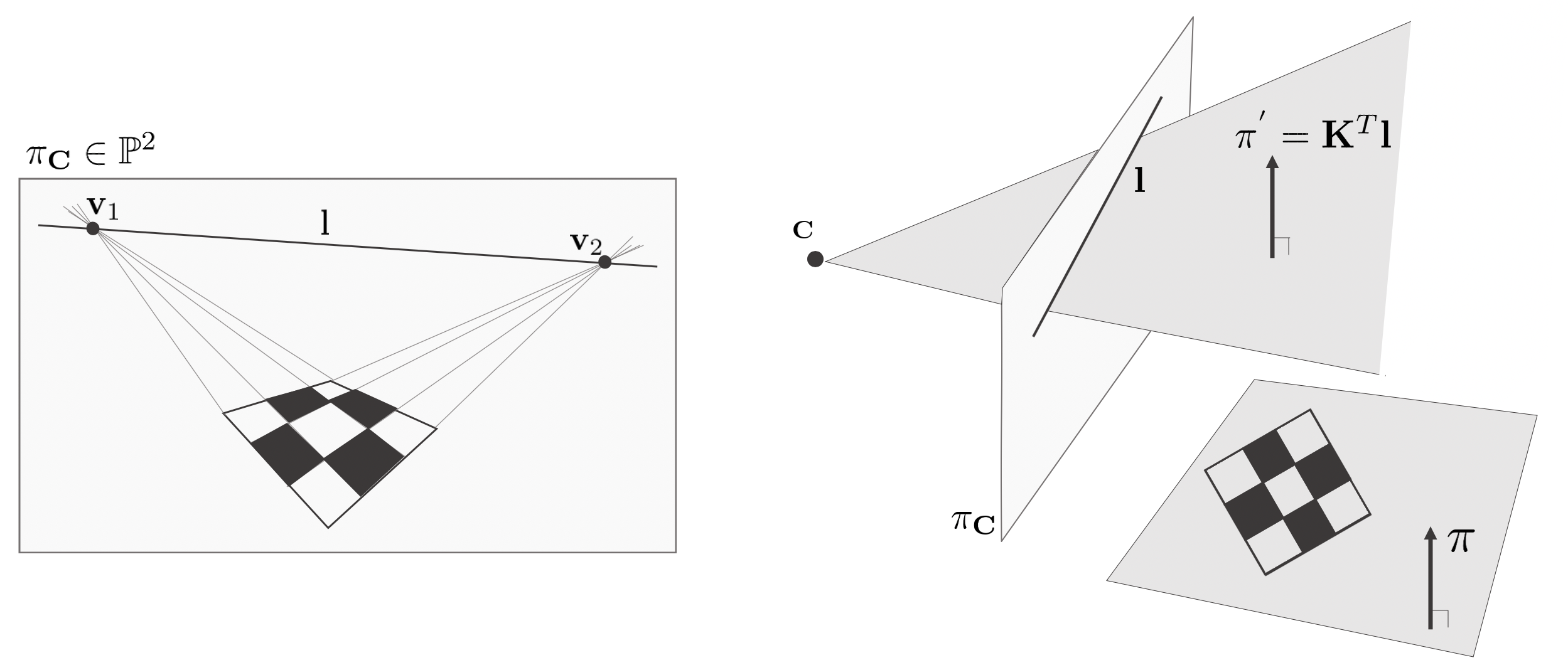 두 개 이상의 소실점(vanishing point) $\mathbf{v}_{i}, i=1,2,\cdots$ 들을 이어준 직선을 소실선(vanishing line) $\mathbf{l}$이라고 한다. 예를 들어 이미지 상의 체크보드가 있고 이로 인해 2개의 소실점 $\mathbf{v}_{1}, \mathbf{v}_{2}$를 구한 경우를 생각해보자. 이 경우, 두 소실점 $\mathbf{v}_{1},\mathbf{v}_{2}$를 이어주는 직선 $\mathbf{l}$을 체크보드 평면 $\pi$의 소실선이라고 한다.
