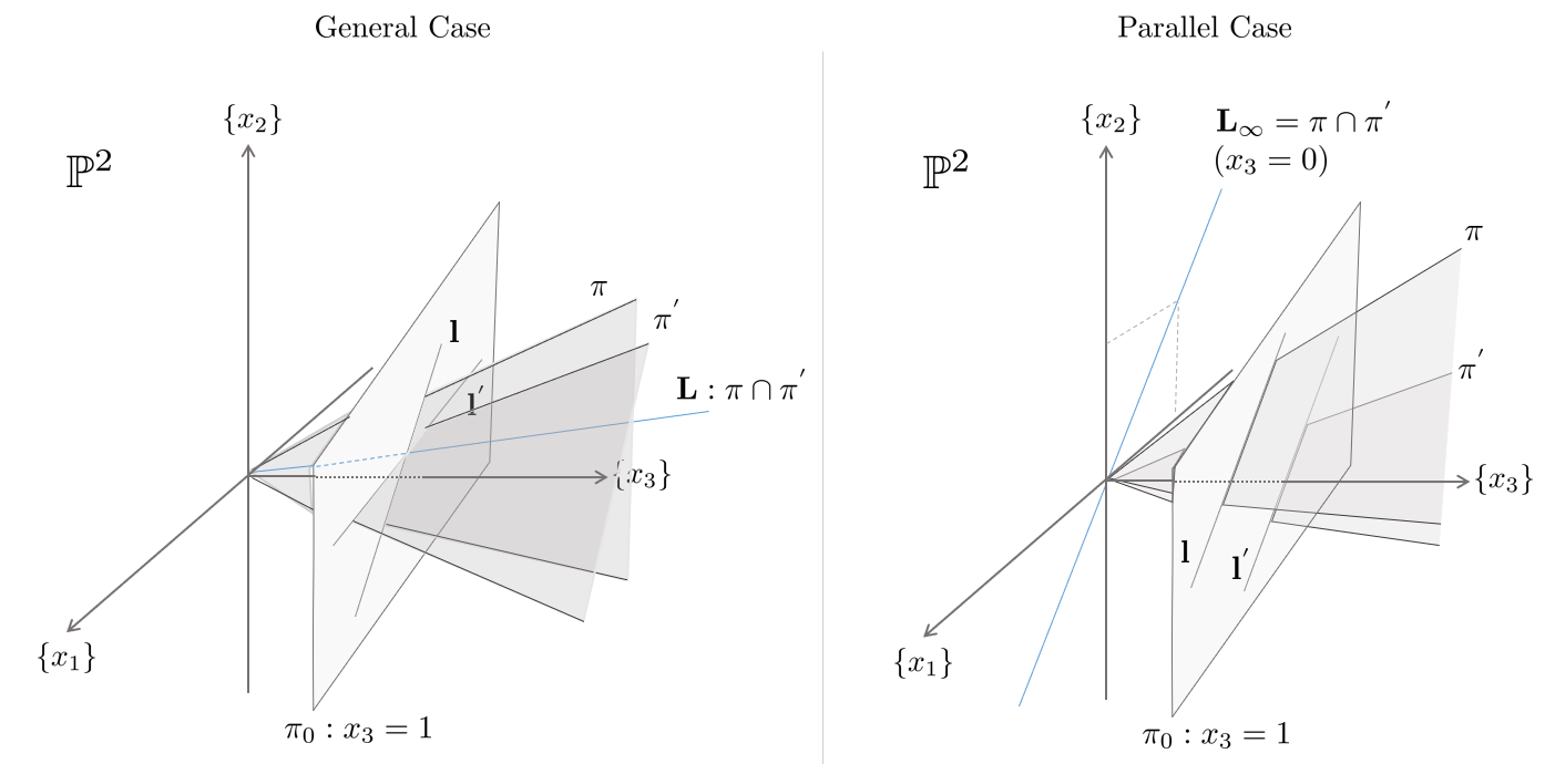 만약 두 직선 $\mathbf{l}, \mathbf{l}^{\prime}$이 평행한 경우 두 직선의 교차점은 $\mathbb{R}^{2}$ 공간에서는 만나지 않지만 $\mathbb{P}^{2}$ 공간에서는 만난다.