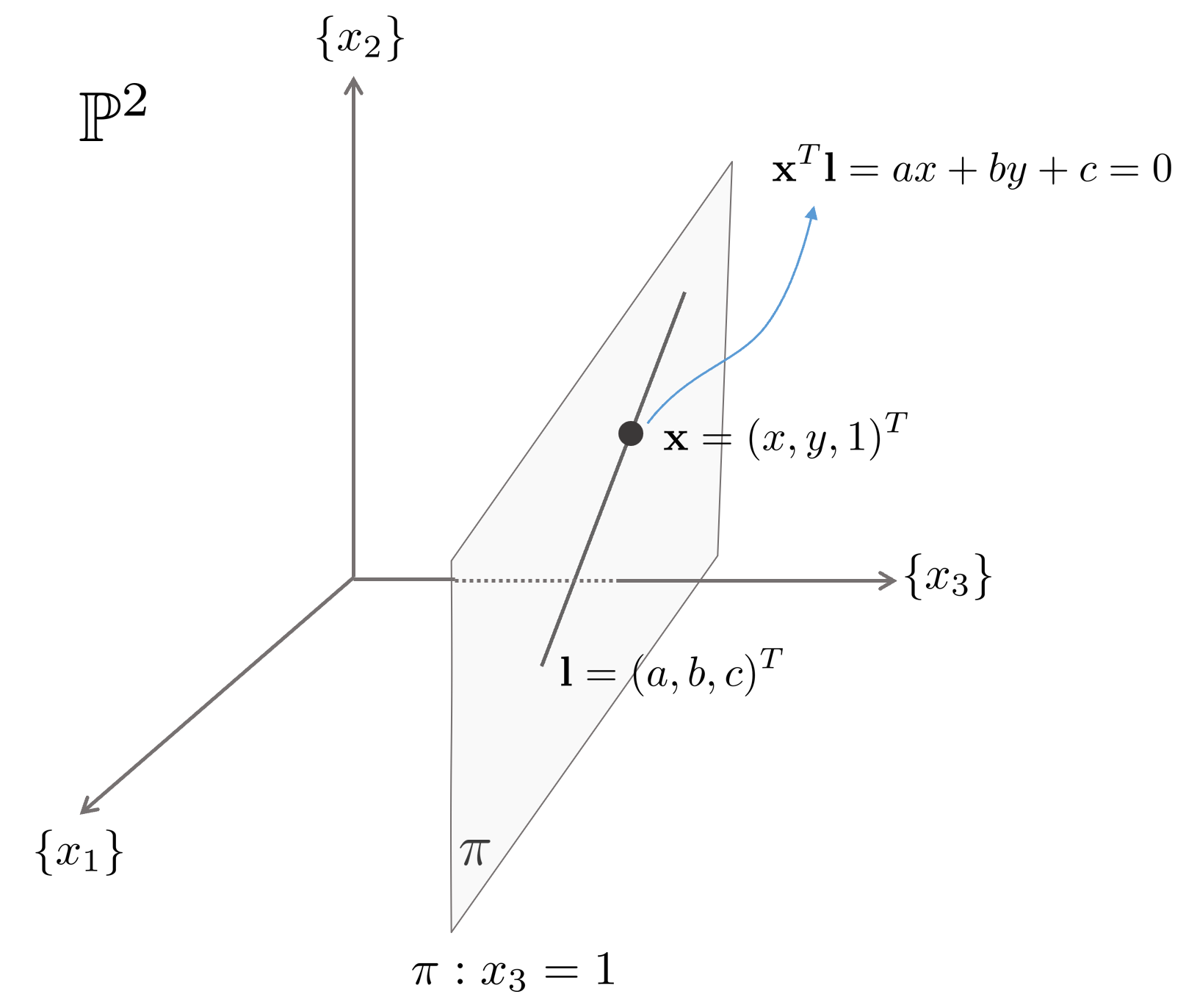 기하학적으로 봤을 때, $\mathbb{P}^{2}$는 3차원 공간 $\mathbb{R}^{3}$에서 원점을 지나는 모든 직선들의 집합 을 의미한다. $\mathbb{P}^{2}$ 상의 모든 벡터를 $k(x_{1},x_{2},x_{3})^{\intercal}$라고 했을 때 $k$ 값에 따라 한 점 $(x_{1},x_{2},x_{3})^{\intercal}$의 위치가 결정된다. $k$는 실수이므로 $k=0$인 경우 원점을 의미하고 $k\neq0$인 경우 무수한 점들의 집합인 직선이 된다. 반대로, 이러한 $\mathbb{R}^{3}$ 공간 상의 원점을 통과하는 한 직선은 $\mathbb{P}^{2}$ 공간 상의 한 점으로 볼 수 있다. 이를 확장하면 $\mathbb{P}^{2}$ 공간 상의 직선 $\mathbf{l}$은 $\mathbb{R}^{3}$ 공간 상의 원점을 포함하는 평면 $\pi$에 대응한다.