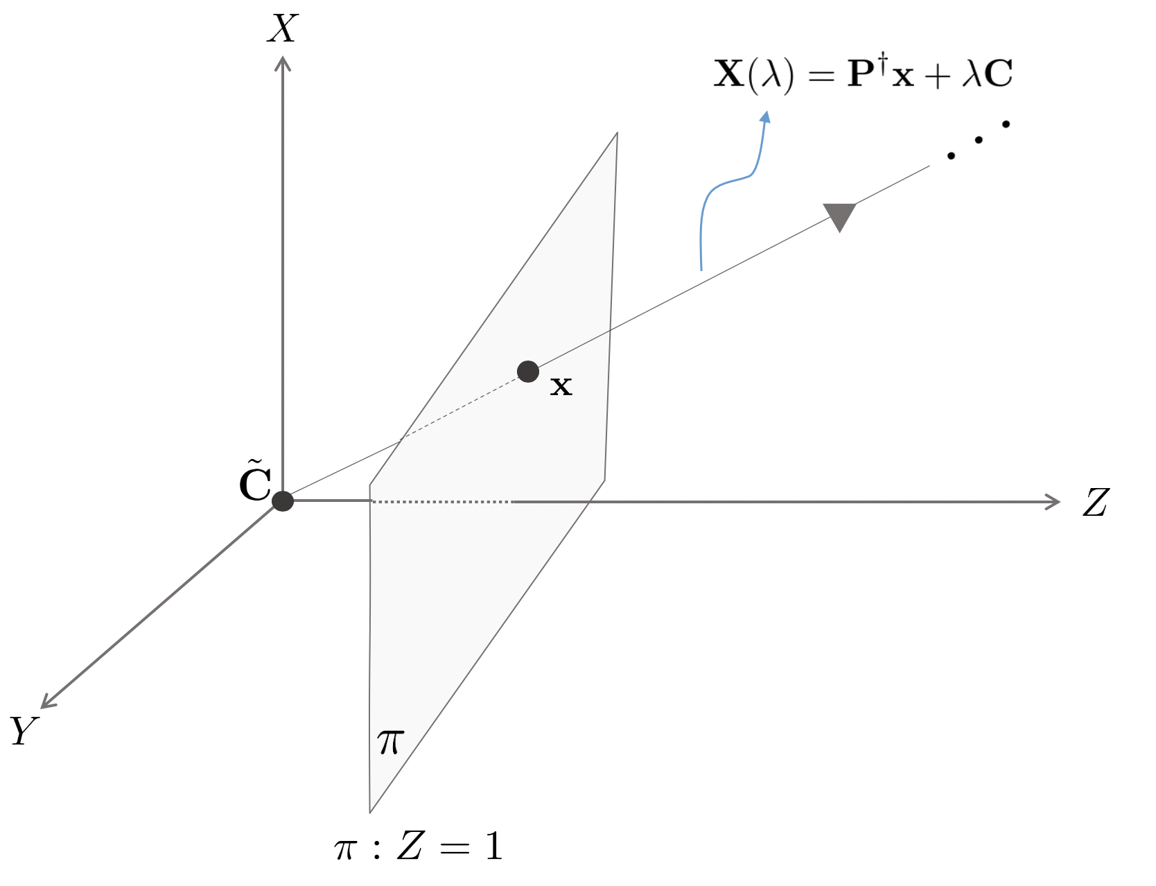 점 $\mathbf{X}(\lambda)$를 이미지 평면에 프로젝션한 점 $\mathbf{x}(\lambda) = \mathbf{PX}(\lambda), \ \ \text{where } \ \mathbf{P} = \mathbf{K}[\mathbf{I}|0]$는 다음과 같이 정의된다.