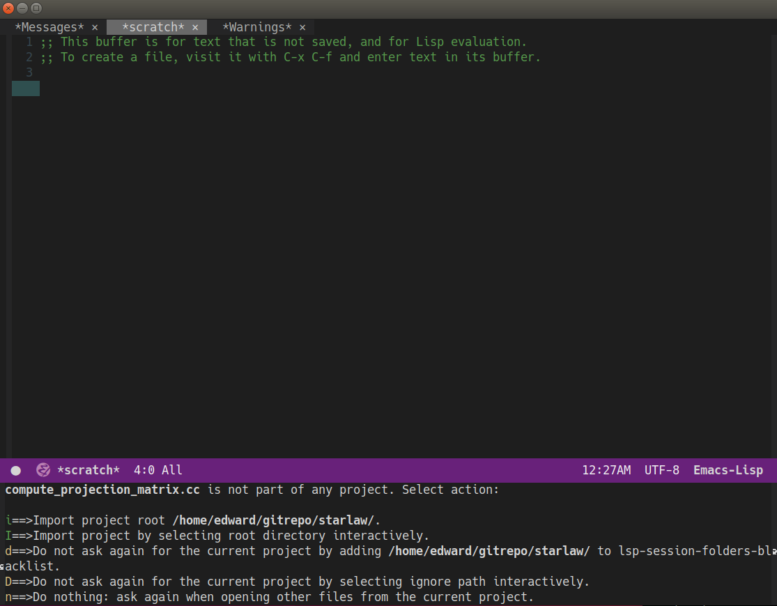 lsp-mode 는 emacs의 코드 네비게이션(함수 이동, 에러 체크) 및 자동완성을 수행하는 패키지이다. lsp-mode 가 설치된 상태에서 맨 처음 파일을 여는 경우 아래와 같이 cmake 프로젝트의 최상단을 입력하라는 창이 뜬다. 제안된 경로가 맞는 경우 i 키를 누르면 되고 임의로 경로를 변경하고 싶은 경우 I 키를 눌러서 변경하면 된다.