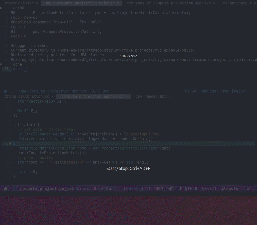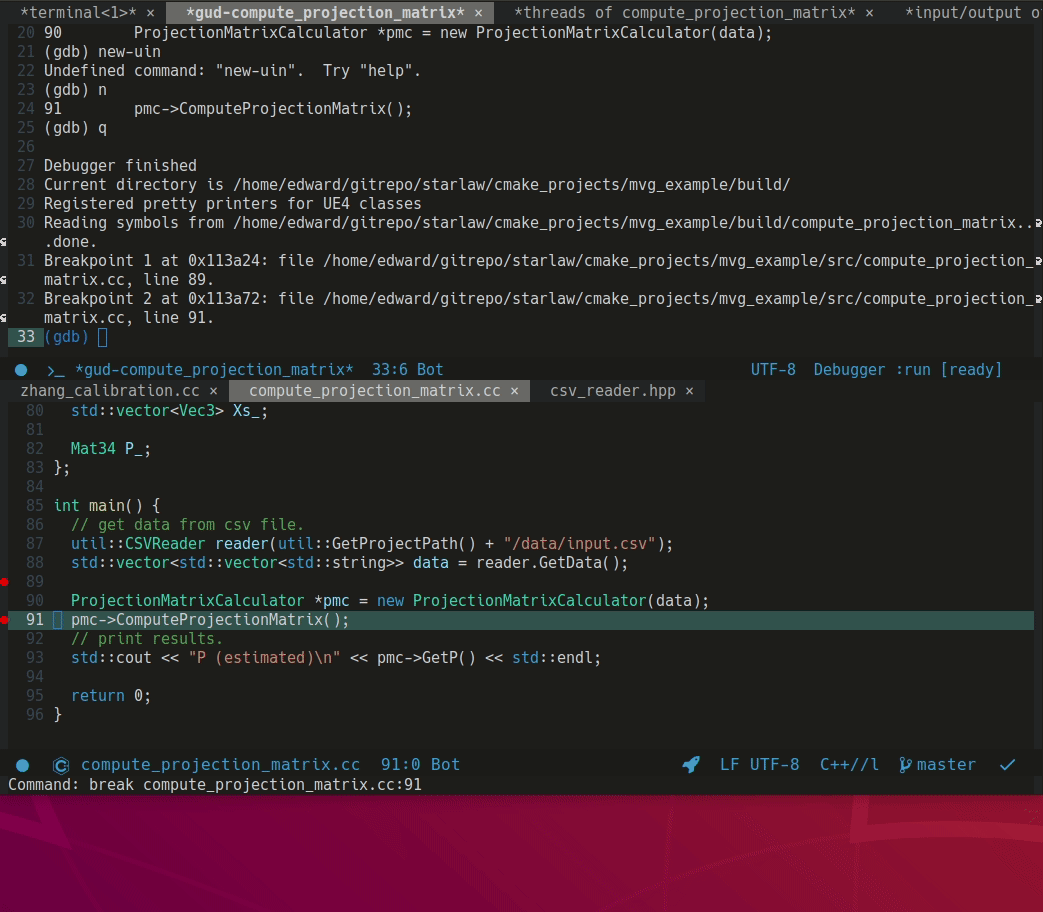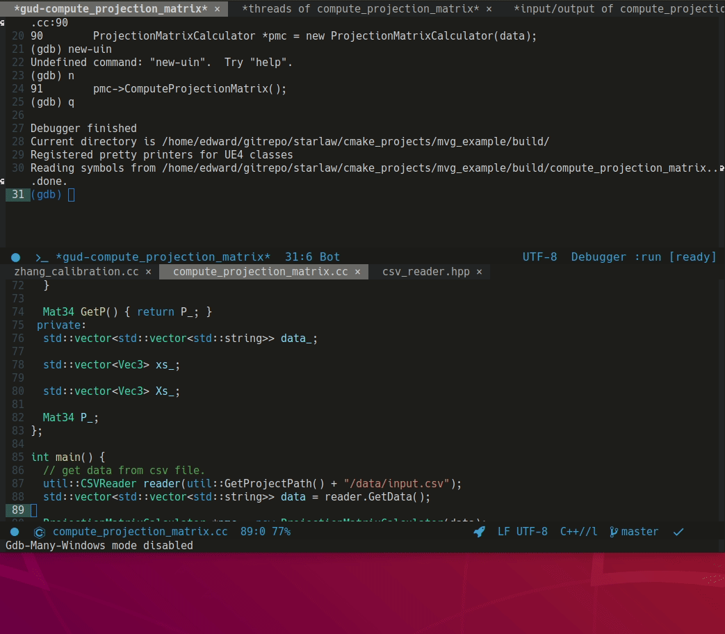 (emacs 기본패키지) gdb 디버깅을 수행하는 패키지. gcc, g++ 컴파일 수행 시 -g 옵션을 추가해줘야 정상적으로 디버깅할 수 있다. 또는 cmake 프로젝트에서 RelWithDebInfo 또는 Debug 모드로 컴파일해야 정상적으로 디버깅할 수 있다.