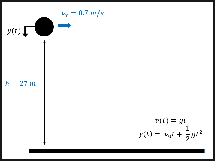 위의 조건을 바탕으로 공이 27m 높이에서 자유낙하하는 애니메이션 코드를 작성하시오. 공의 질량은 무시하며 바닥과 공은 완성탄성충돌을 한다.