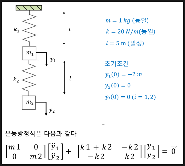 위의 조건을 바탕으로 2자유도 스프링-질량계의 움직임을 애니메이션화하는 코드를 작성하시오. 단, 중력에 의한 평형상태를 x1 = 5m, x2 = 10m 로 보고 중력의 영향을 무시한다.