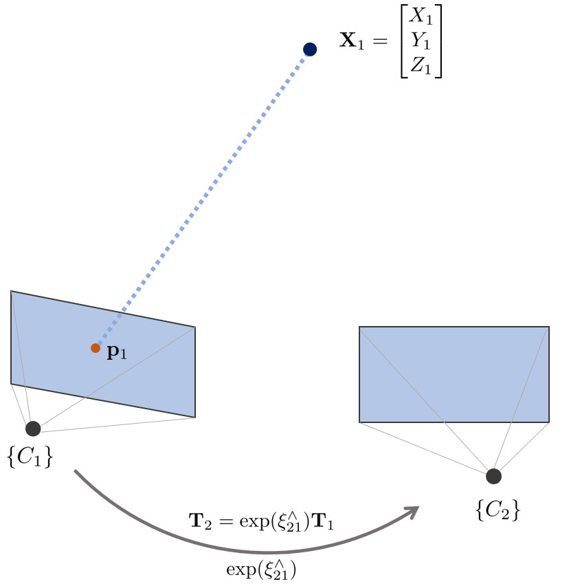 $$\mathbf{p}_{2} = \pi(\exp(\xi^{\wedge}_{21})\mathbf{X}_{1}) = \pi(\exp(\xi^{\wedge}_{21})\pi^{-1}(\mathbf{p}_{1}))$$