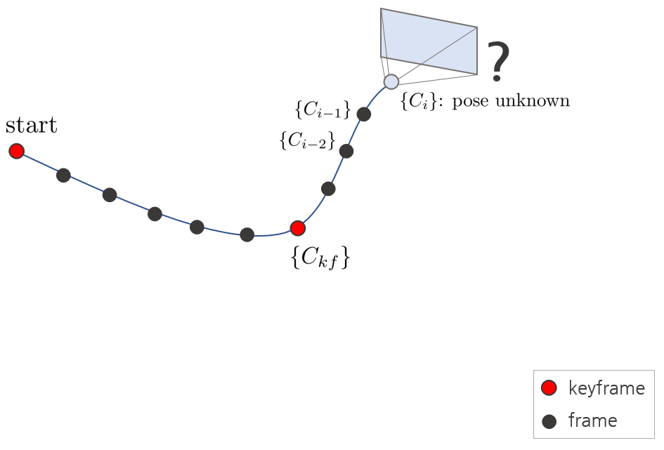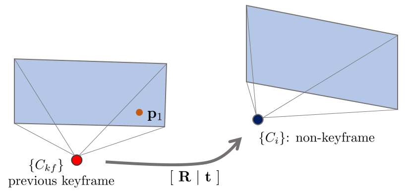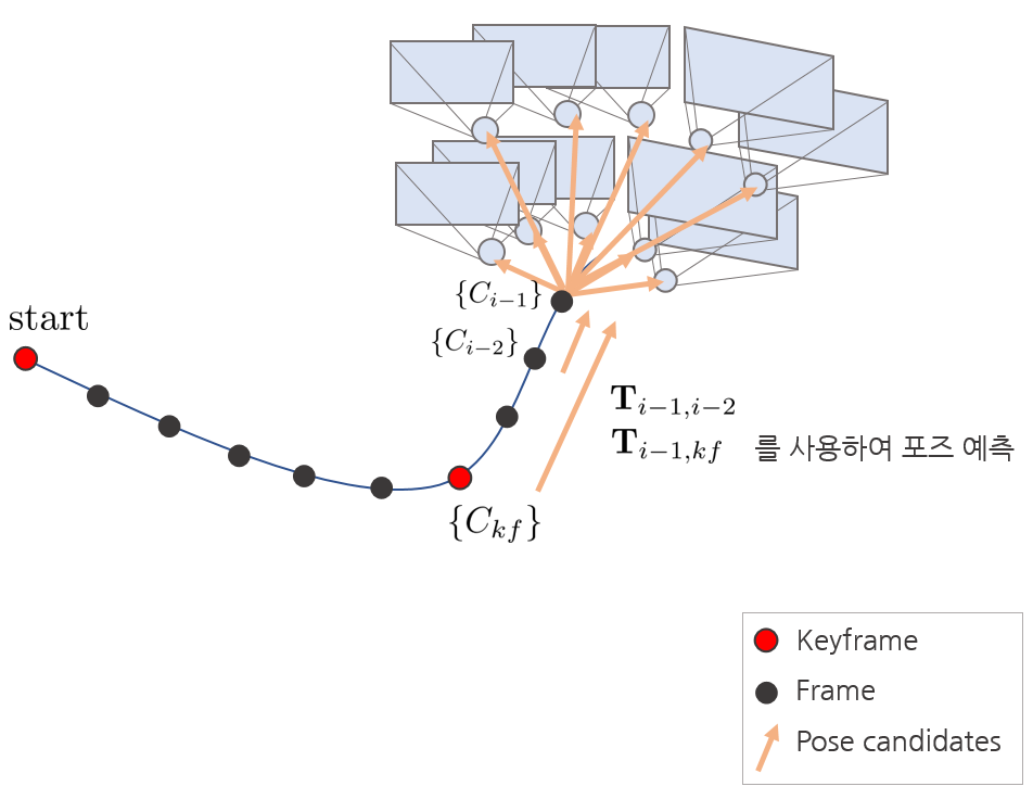 두 프레임($\mathbf{T}_{i-1,i-2}$)과 한 개의 키프레임($\mathbf{T}_{i-1,kf}$)을 참조하여 이들의 상대 포즈를 구한 후 정지, 직진, 후진, 회전 등 다양한 케이스에 대한 밝기 오차를 구한다. 이 때, 가장 높은 이미지 피라미트(가장 작은 크기 이미지)부터 가장 낮은 이미지 피라미드(원본 크기)까지 순차적으로 밝기 오차를 구하는 coarse-to-fine 방법을 통해 현재 프레임의 3차원 포즈를 구한다.