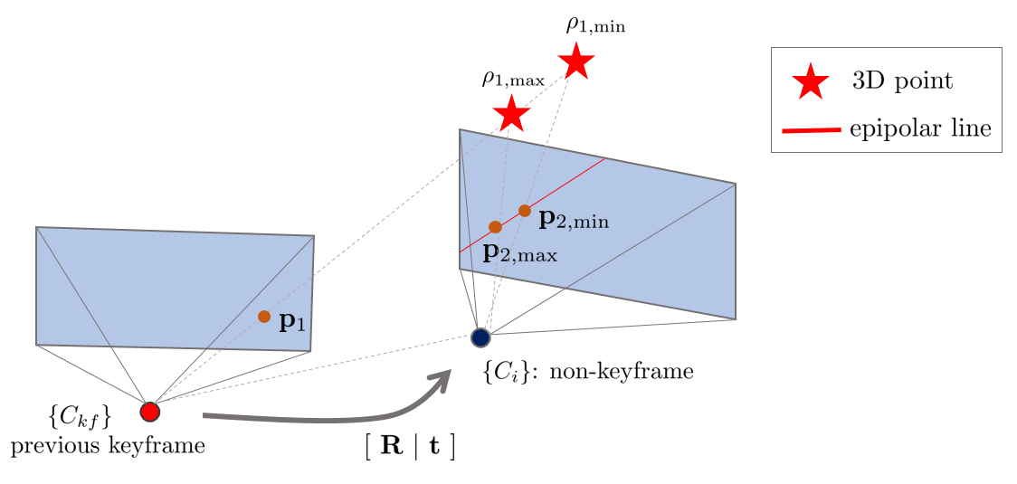 2. 이 때, $\mathbf{p}_{1}$을 한 번만 프로젝션하지 않고 epipolar line을 찾기 위해 idepth 값을 변경해서 총 2번 프로젝션한다.