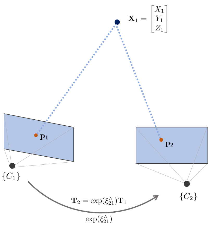 - $\exp(\xi_{21}^{\wedge}) \in \text{SE}(3)$ : C1, C2 카메라 간 상대 포즈 (lie group) (4x4 행렬)