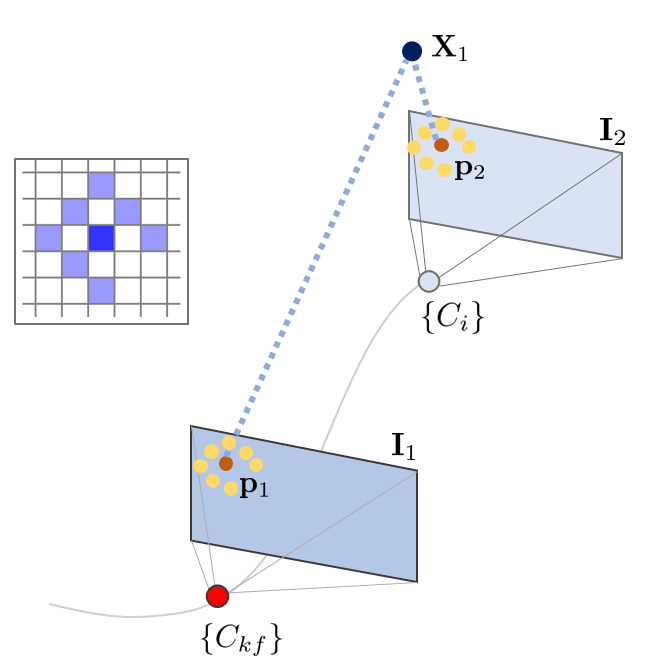 DSO는 한 점에서 밝기 차이만을 고려하지 않고 한 점 주위의 총 8개의 점들 patch 밝기 차이를 고려한다. 위 이미지와 같이 1개의 점이 생략된 이유는 성능에 크게 영향을 주지 않으면서 4번의 float 연산을 한 번에 계산할 수 있는 SSE2 레지스터를 사용하여 속도를 가속하기 위함이다.