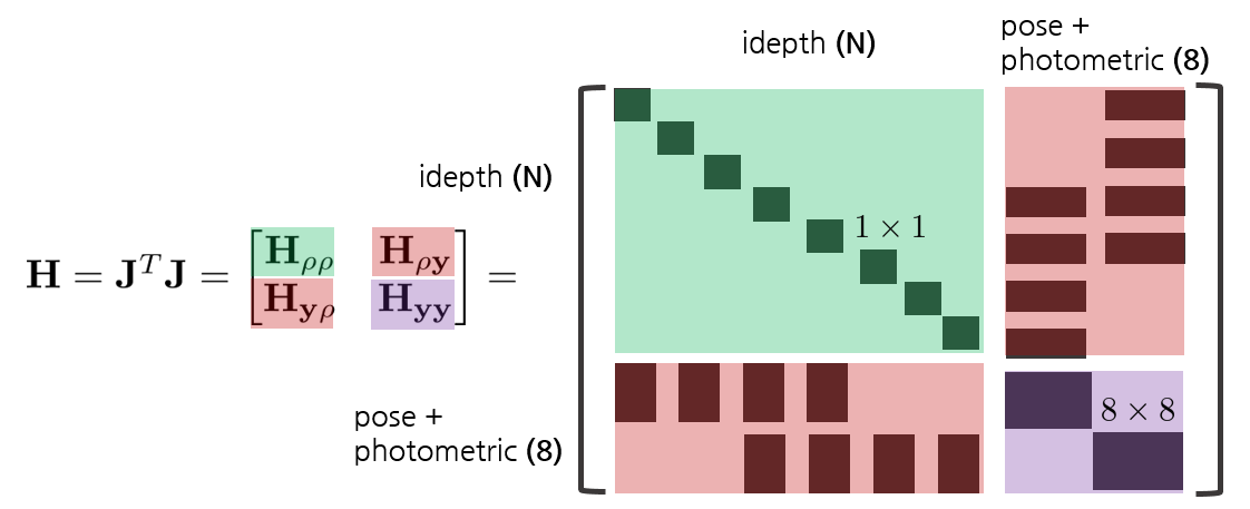 inverse depth와 관련있는 항인 $\mathbf{H}_{\rho\rho}$는 NxN 크기의 대각행렬(diagonal matrix)이므로 쉽게 역행렬을 구할 수 있다. 따라서 $\mathbf{H}_{sc}, \mathbf{b}_{sc}$ 또한 다음과 같이 비교적 간단하게 계산할 수 있다.