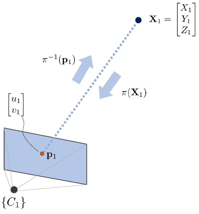 $$\mathbf{X}_{1} = \pi^{-1}(\mathbf{p_{1}}) = \mathbf{K}^{-1}/\rho_{1}\mathbf{p}_{1}$$