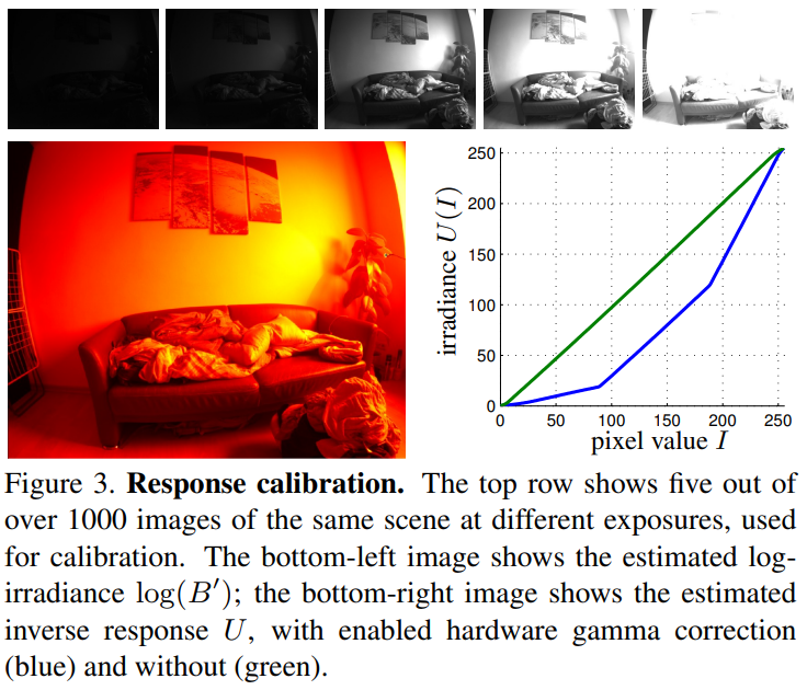 위 그림에서 중간의 그래프를 보면 이미지 시퀀스에 따른 노출시간의 변화를 의미한다. 값을 보면 동일한 데이터 내에서도 0.018ms ~ 10.5ms까지 최대 500배 이상의 노출시간 변화가 발생하는 것을 알 수 있다. DSO는 이러한 카메라 노출시간 변화에 따른 밝기 변화를 에러함수로 모델링하지 않고 캘리브레이션함으로써 direct method의 포즈 추정 성능을 대폭 상승시켰다.