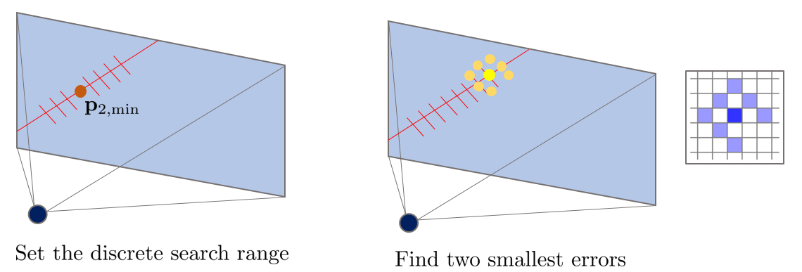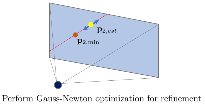 6. 해당 $\mathbf{p}_{2,est}$ 점은 discrete search를 통해 찾은 값이므로 보다 정교한 위치를 찾기 위해 GN 최적화를 수행하여 최적의 위치 $\mathbf{p}_{2}^{*}$를 구한다.