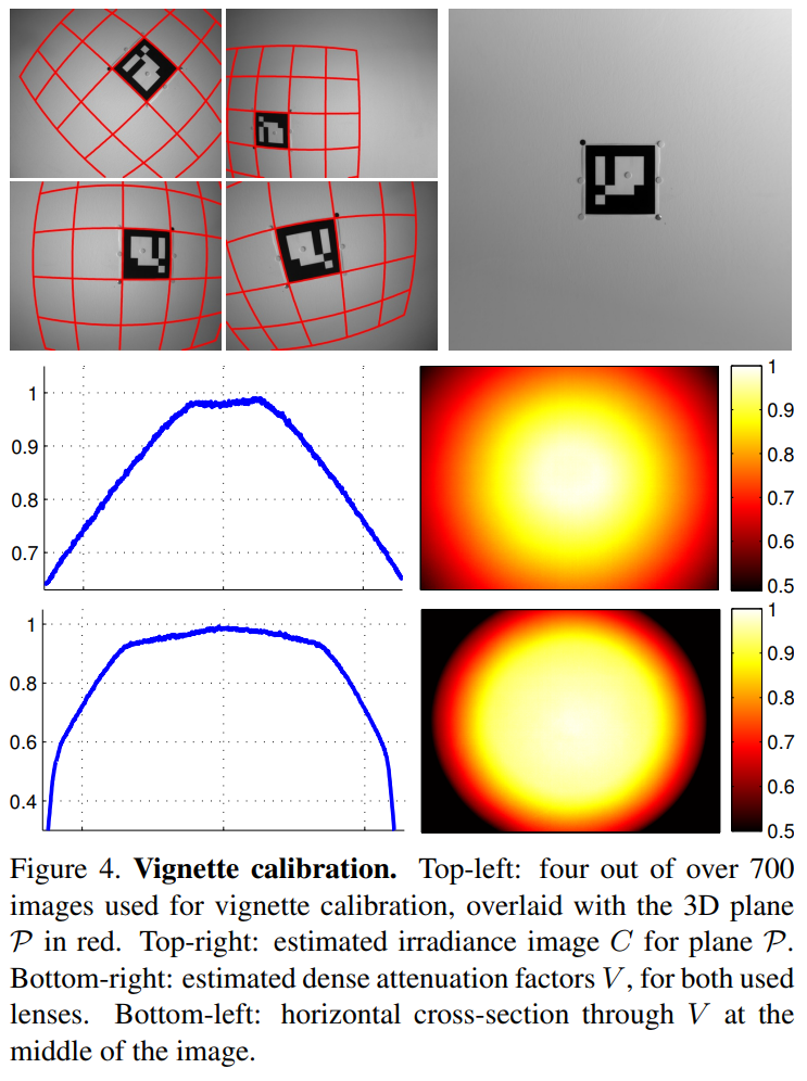 따라서 DSO 논문에서는 VO 알고리즘에서 일반적으로 수행하는 geometric calibration과 더불어 photometric calibration이라는 방법을 수행하였다. photometric calibration은 카메라의 노출시간(exposure time), 비네팅(vignetting), 카메라 반응함수 등을 고려하여 direct method가 지속적으로 밝기오차를 최적화할 수 있도록 한다. 자세한 공식은 다음과 같다.