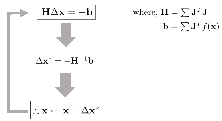 해당 Jacobian을 사용하여 $\mathbf{H}, \mathbf{b}$를 각각 계산한다.