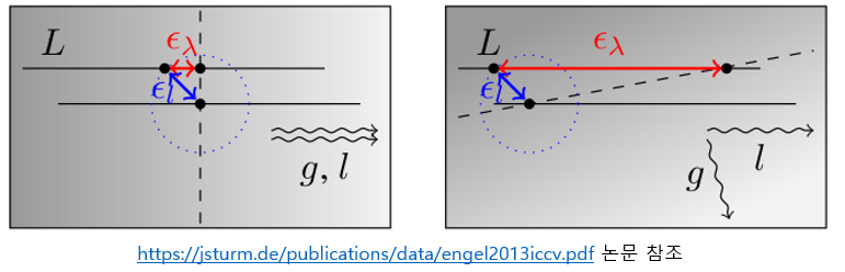 여기서 $\alpha$ 값은 gradient 방향과 epipolar line의 방향이 수직일수록 1에서부터 값이 증가하는 가중치를 의미한다. 해당 $\alpha$ 값이 너무 커지면 두 방향이 거의 수직에 가깝다고 판단하여 idepth 업데이트를 중단한다. 이와 같은 1~8. 과정을 통해 이전 키프레임에서 immature point $\mathbf{p}_{1}$의 idepth 값을 업데이트할 수 있다.