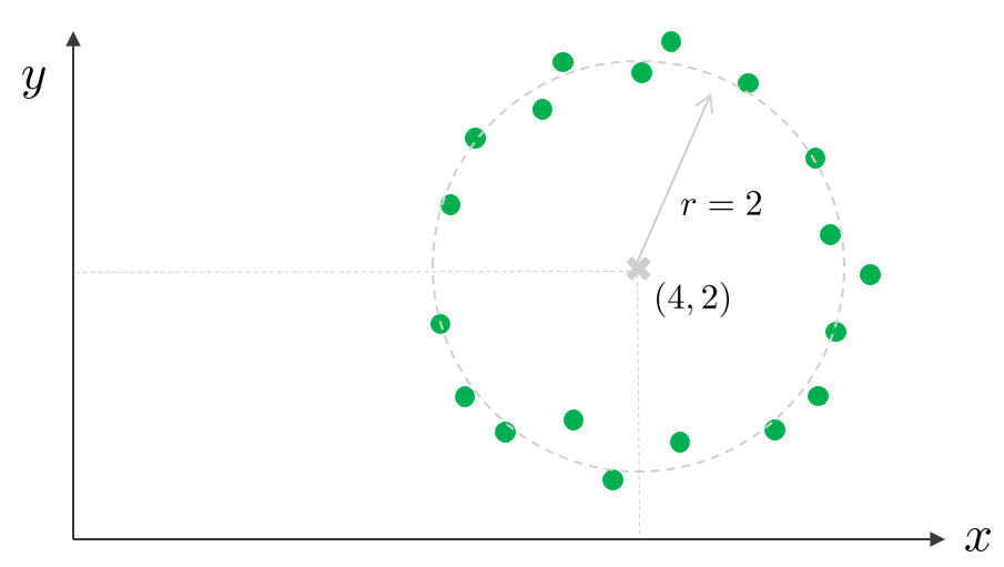위와 같은 초록색 점들의 분포가 있을 때, 해당 데이터를 가장 잘 표현하는 원의 중점과 반지름을 구하시오. (정답: 회색 점선)