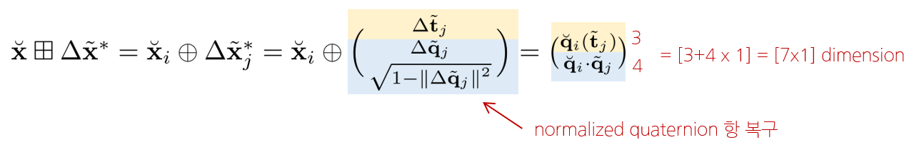 $\breve{\mathbf{x}} $의 회전이 full quaternion (over-parameterized)로 표현된 경우 $\breve{\mathbf{x}} $와 $\Delta \tilde{\mathbf{x}}$는 아래와 같이 표현할 수 있다.