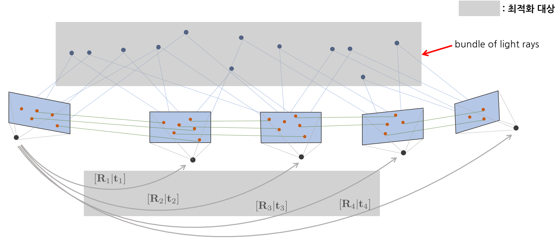 BA는 위 그림과 같이 연속적인 카메라 영상 + 매칭 쌍이 주어졌을 때 카메라 포즈 전체와 월드 상 점들 전체에 대한 최적의 위치를 찾는 방법을 말한다. 이 때, 특징점을 사용하는 VO의 특성 상 reprojection 에러를 최소화하여 카메라 포즈와 3차원 점들을 최적화한다.