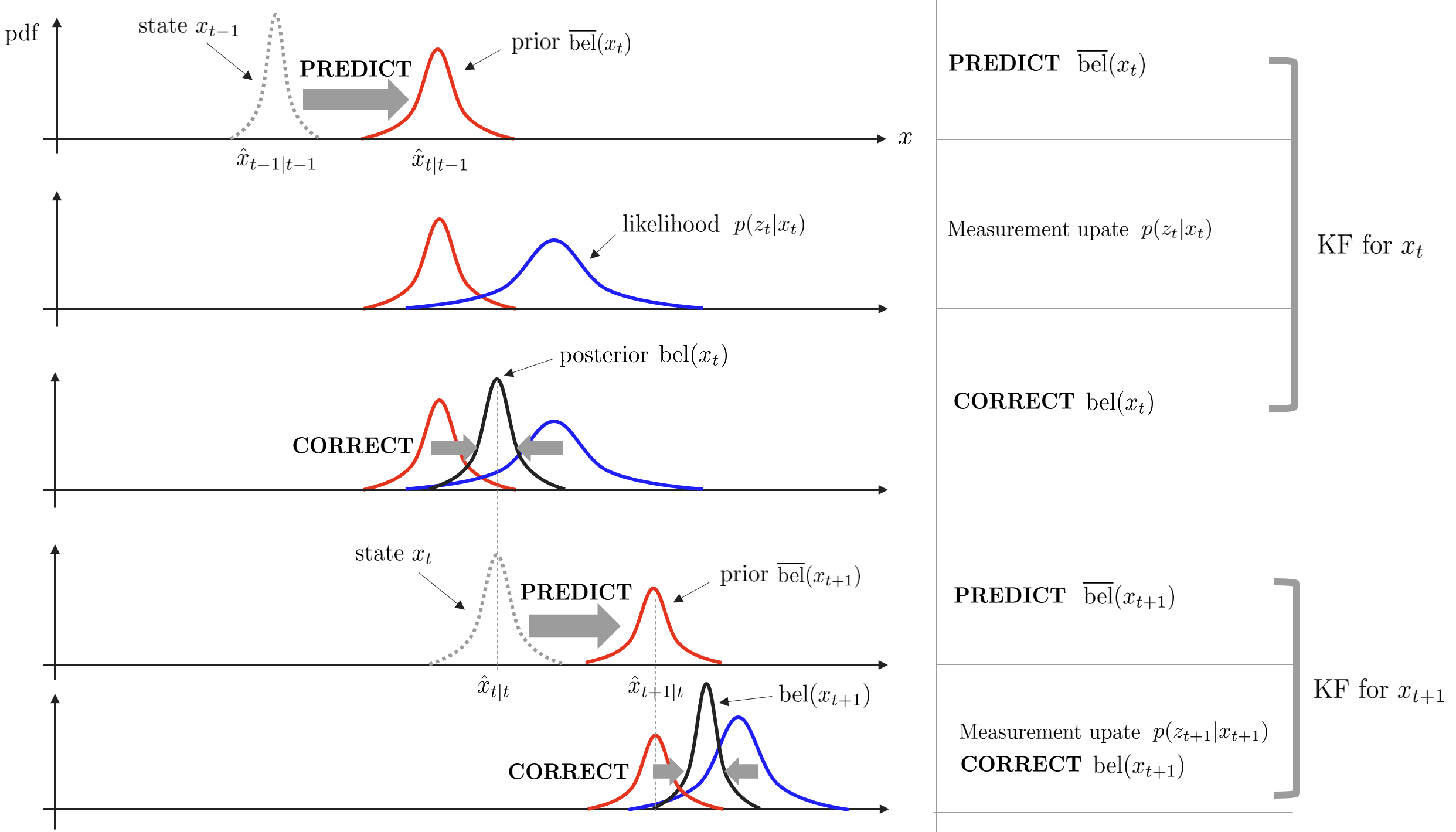 - $\text{bel}(\mathbf{x}_{t})$ : Belief of $\mathbf{x}_{t}$라고 불리며 시작 시간부터 $t$초까지 센서를 통한 관측 $ \mathbf{z}_{1:t}$과 제어입력 $\mathbf{u}_{1:t}$으로 인해 현재 로봇이 $\mathbf{x}_{t}$에 위치할 확률(믿을만한 정도)을 의미